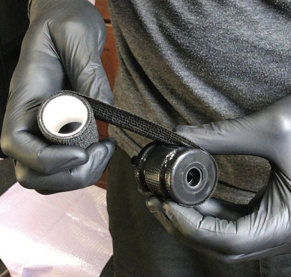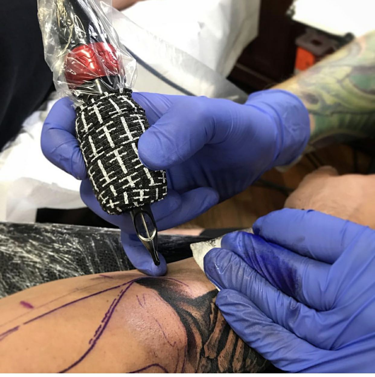 Завој за лепило за тетоважа е еластичен завој за завој направен од 90% неткаена ткаенина и 10% спандекс, тоа е лепило завој. Честопати се користи за да се завитка околу рачката на машината за тетоважа, што помага да се спречи лизгањето на рачката за време на употребата и го зголемува триењето на прстите, што може да ви помогне да ги нацртате дизајни за тетоважи поточно.